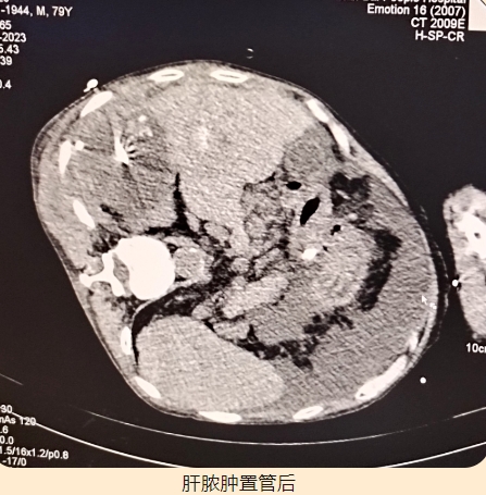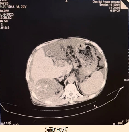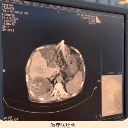 80歲的楊大爺,2016年1月被診斷為“原發(fā)性肝癌”,外院先后共行4次介入治療術(shù),2018年11月和2022年4月期間兩次復(fù)發(fā),再次行介入治療,直至今年因消化道出血并肝性腦病到我院ICU住院治療,盡管治療后病情有所緩解,但身體恢復(fù)很差,反復(fù)腰腹痛,乏力,胃口差,精神疲倦,最后轉(zhuǎn)入腫瘤介入科進(jìn)行進(jìn)一步治療。復(fù)發(fā)肝癌,發(fā)展速度迅猛,生命岌岌可危,加上楊大爺年紀(jì)較大,難以經(jīng)受病情的反復(fù)折磨,家屬更是一籌莫展。急病人所急,想病人所想,我院集中力量再次請(qǐng)到廣東省人民醫(yī)院腫瘤介入科許榮德教授會(huì)診,經(jīng)過(guò)一番縝密的病情討論,決定施行CT引導(dǎo)下肝癌微波消融術(shù)+肝囊腫穿刺術(shù)。在許榮德教授的帶領(lǐng)下,我院腫瘤介入科團(tuán)隊(duì)順利完成我院首例肝癌微波消融術(shù)。肝囊腫穿刺抽出膿液,予以留置引流管。術(shù)后楊大爺逐步恢復(fù),腰腹痛明顯減輕,胃口、精神顯著改善,他和家屬的臉上都露出了久違的笑容,還夸贊醫(yī)護(hù)人員技術(shù)精湛,品德高尚!