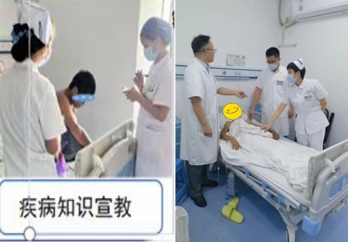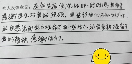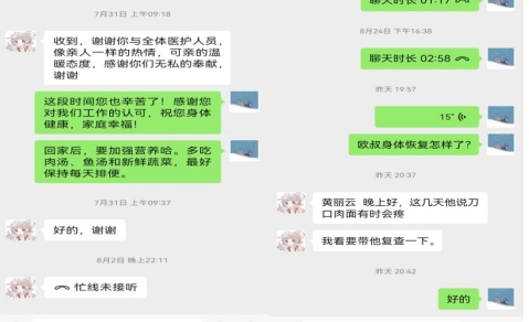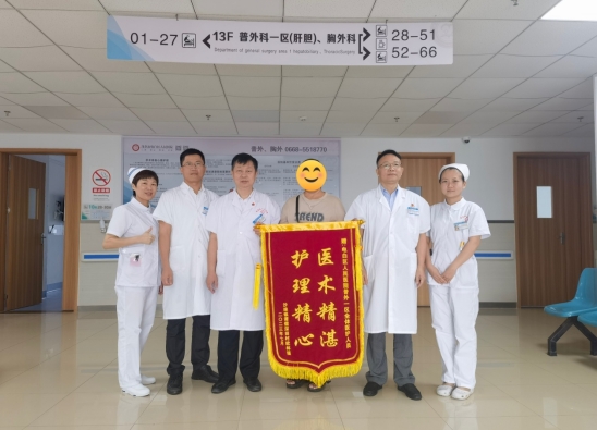 該患者性格內(nèi)向、脾氣倔強(qiáng),初入院時(shí)情緒焦慮,擔(dān)心預(yù)后影響正常生活,在住院期間不配合術(shù)后的護(hù)理治療及康復(fù)治療,護(hù)理團(tuán)隊(duì)及時(shí)制定術(shù)后護(hù)理康復(fù)方案,護(hù)士利用視頻、圖片每天耐心給患者做疾病知識(shí)宣講,進(jìn)行康復(fù)指導(dǎo);喬安意教授、張子恒主任、鄭樂(lè)副主任、黃麗云護(hù)長(zhǎng)每天跟蹤病患康復(fù)進(jìn)展情況,給患者介紹手術(shù)成功案例,為患者樹(shù)立快速康復(fù)的信心?;颊呓K于因滿滿的關(guān)懷與愛(ài)心打開(kāi)心扉,積極配合術(shù)后的快速康復(fù)治療,順利康復(fù)出院。出院當(dāng)天,歐某妻子送上一面錦旗,盛贊普外科一區(qū)醫(yī)護(hù)團(tuán)隊(duì)“醫(yī)術(shù)精湛,護(hù)理精心”。