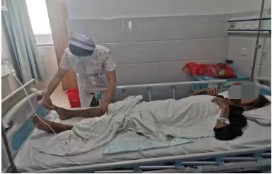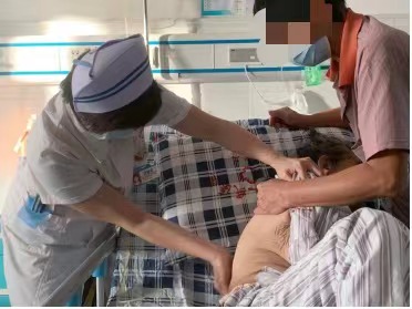 ▲崔麗榮在普外科二區(qū)協(xié)助術(shù)后重病人翻身拍背,預(yù)防壓瘡。