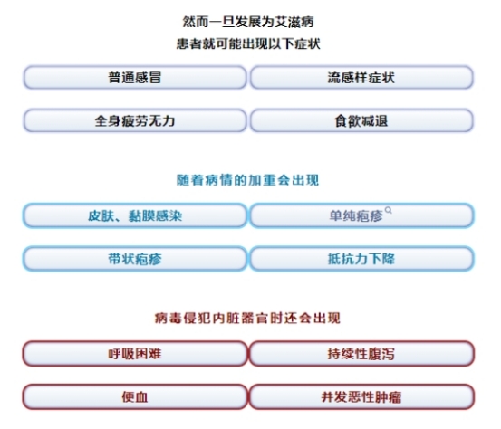 感染HIV后的最終階段:腹瀉,大便次數(shù)多余3次/天;體重下降,6個月之內體重下降10%以上;盜汗,神經精神癥狀,記憶力減退、頭痛、精神淡漠,性格改變、癲癇及癡呆等。