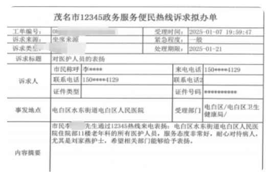 李大爺通過12345表?yè)P(yáng)了老年醫(yī)學(xué)科所有醫(yī)護(hù)人員服務(wù)態(tài)度非常好,耐心對(duì)待病人。何阿姨家屬通過微信、寫表?yè)P(yáng)信的形式,高度贊揚(yáng)了老年醫(yī)學(xué)科醫(yī)護(hù)人員的專業(yè)素養(yǎng)和貼心服務(wù)。