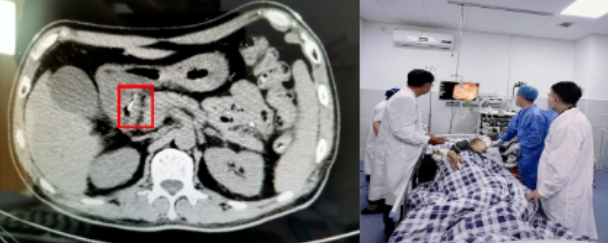 影像科通過(guò)腹部CT提示十二指腸球區(qū)異物存留,但未見(jiàn)明顯穿孔。普外科鄭樂(lè)副主任結(jié)合CT結(jié)果及患者臨床表現(xiàn),精準(zhǔn)判斷為十二指腸球部異物損傷伴出血,且未導(dǎo)致穿孔,建議優(yōu)先嘗試內(nèi)鏡下取出異物及止血,必要時(shí)再行外科手術(shù)。麻醉科李秀蒲主任則根據(jù)患者復(fù)雜病史,制定了安全的麻醉方案:充分液體復(fù)蘇、備血后可行靜脈全麻,必要時(shí)轉(zhuǎn)為氣管插管全麻,為手術(shù)安全提供了有力保障。