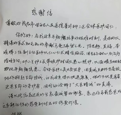 陳奶奶家屬送來(lái)的感謝信在醫(yī)生辦公室熠熠生輝,不僅是對(duì)一個(gè)科室的褒獎(jiǎng),更是對(duì)我院整體躍遷的見(jiàn)證。在省級(jí)醫(yī)院的強(qiáng)力支撐下,我們正以創(chuàng)建三甲醫(yī)院為契機(jī),朝著"技術(shù)有精度、服務(wù)有溫度、管理有維度"的現(xiàn)代化醫(yī)院穩(wěn)步邁進(jìn),讓更多群眾在家門(mén)口就能享受優(yōu)質(zhì)醫(yī)療服務(wù)。
