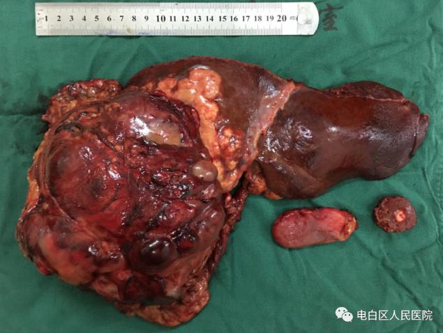 經(jīng)過充分的術(shù)前準(zhǔn)備,10月9日,在全麻下手術(shù)探查:術(shù)中發(fā)現(xiàn)肝臟超過25厘米巨大腫瘤,侵及肝S12345段,右肝S6亦有一1厘米結(jié)節(jié),考慮轉(zhuǎn)移灶。