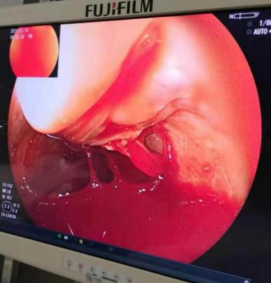 內(nèi)四科梁小波主任和ICU楊勇主任與家屬充分溝通后,決定一邊輸血—邊補(bǔ)液下給患者行內(nèi)鏡下止血治療。當(dāng)時(shí)進(jìn)鏡至口腔即有大量新鮮血液涌出,反復(fù)抽吸血液,緩慢進(jìn)鏡,距門齒25cm起食管見(jiàn)3條藍(lán)色,明顯突出食管粘膜曲張靜脈,直徑8-12mm,距門齒30cm處見(jiàn)一曲張靜脈破口正在噴血。見(jiàn)到此情景,大家都驚呆了,如此大的出血量,幾秒鐘內(nèi)鏡就沒(méi)視野了,對(duì)套扎治療難度極大,必需一邊吸出食管血液,一邊對(duì)準(zhǔn)出血口下端的靜脈套扎。在梁小波主任指導(dǎo)下,周沖醫(yī)生耐心冷靜地操作,第一環(huán)終于套出了,剛好套在距出血口下端2cm處的曲張靜脈,噴血一下子停住了,出血點(diǎn)處只有少量血液滲出,內(nèi)鏡下的視野一下子好了起來(lái)。緊接著又對(duì)出血點(diǎn)處及上端套扎,出血止,隨后患者血壓緩慢上升,面色開始紅潤(rùn)。