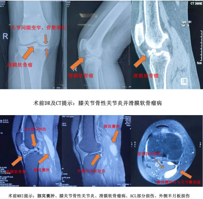 一位中年女性患者,反復(fù)右膝關(guān)節(jié)疼痛,并覺得后方腫脹,偶有打軟腿、關(guān)節(jié)交鎖癥狀,經(jīng)休息等保守治療無好轉(zhuǎn),經(jīng)人介紹到我院外五科(骨外科-2區(qū))就診。入院后完善相關(guān)檢查,結(jié)合患者的病史、體征及影像學(xué)檢查,診斷為:右側(cè)腘窩囊腫、右膝滑膜軟骨瘤病、右膝關(guān)節(jié)骨性關(guān)節(jié)炎并游離體。程良才主任、張文聰副主任及管床醫(yī)師劉通查閱相關(guān)文獻(xiàn)并經(jīng)科室集體討論,考慮患者膝關(guān)節(jié)骨性關(guān)節(jié)炎繼發(fā)腘窩囊腫、滑膜軟骨瘤病、ACL及半月板損傷等關(guān)節(jié)內(nèi)疾患,考慮腘窩囊腫為繼發(fā)性腘窩囊腫。