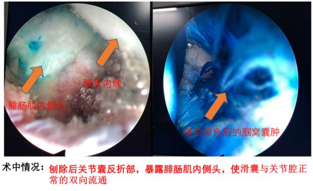 結(jié)合患者病情決定為患者行關(guān)節(jié)鏡下雙后內(nèi)側(cè)通道下行腘窩囊腫切除術(shù)并一起處理患者其他關(guān)節(jié)腔的疾患,當(dāng)日由張文聰副主任主刀,劉通醫(yī)師作為助手為患者進(jìn)行手術(shù)治療。術(shù)中過程順利,出血量小。術(shù)后患者第一天即可下地自由活動,無明顯疼痛,康復(fù)快,無并發(fā)癥發(fā)生,患者術(shù)后對手術(shù)效果非常滿意。