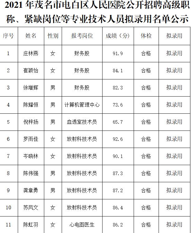 附件:2021年茂名市電白區(qū)人民醫(yī)院公開招聘高級職稱、緊缺崗位等專業(yè)技術(shù)人員擬錄用名單公示