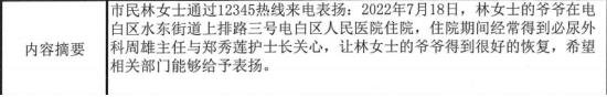 近日,我院收到茂名市12345政府服務(wù)熱線平臺轉(zhuǎn)來的表揚信息,市民林女士致電要求表揚我院泌尿外科醫(yī)生周雄與護(hù)士長鄭秀蓮。